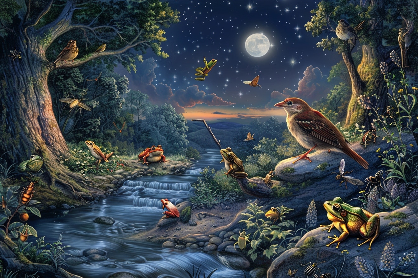 La nuit tombe, et avec elle un concert envoûtant prend vie au cœur de la nature. Les murmures de la nuit révèlent une symphonie mystérieuse et ensorcelante où chaque note semble être jouée par la faune nocturne dans un ballet sonore harmonieux.
